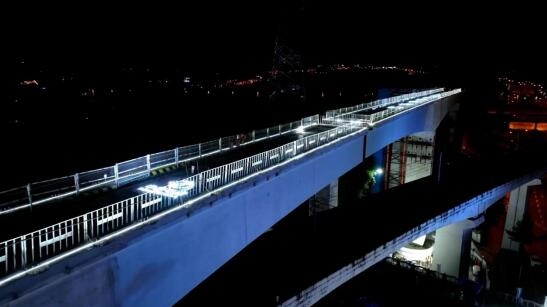 為最大程度減少對運營線路的影響,縮短建設工期,保障施工安全,項目部決定采用橋梁轉體工藝進行施工,即在6號線兩側將T構連續梁澆筑完成,以橋墩為軸逆時針轉體,跨越既有6號線進行對接。728156分,6號線東延工程劉家坪站至百樂園站高架區間的兩座T構連續梁轉體橋開始轉體施工經過52分鐘的轉體作業后,實現精準對接,這既是6號線東延工程高架區間首座連續梁轉體,也是重慶軌道交通領域首次實現連續梁跨越既有軌道交通線路轉體,為后續類似施工提供了范本。
