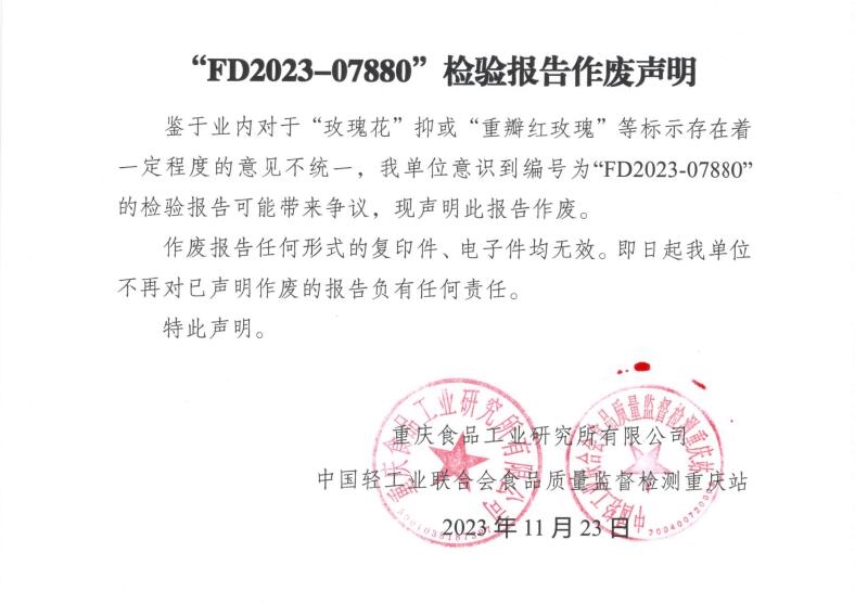 鑒于業(yè)內(nèi)對于“玫瑰花”抑或“重瓣紅玫瑰”等標(biāo)示存在著一定程度的意見不統(tǒng)一,我單位意識到編號為“FD2023-07880”的檢驗報告可能帶來爭議,現(xiàn)聲明此報告作廢。